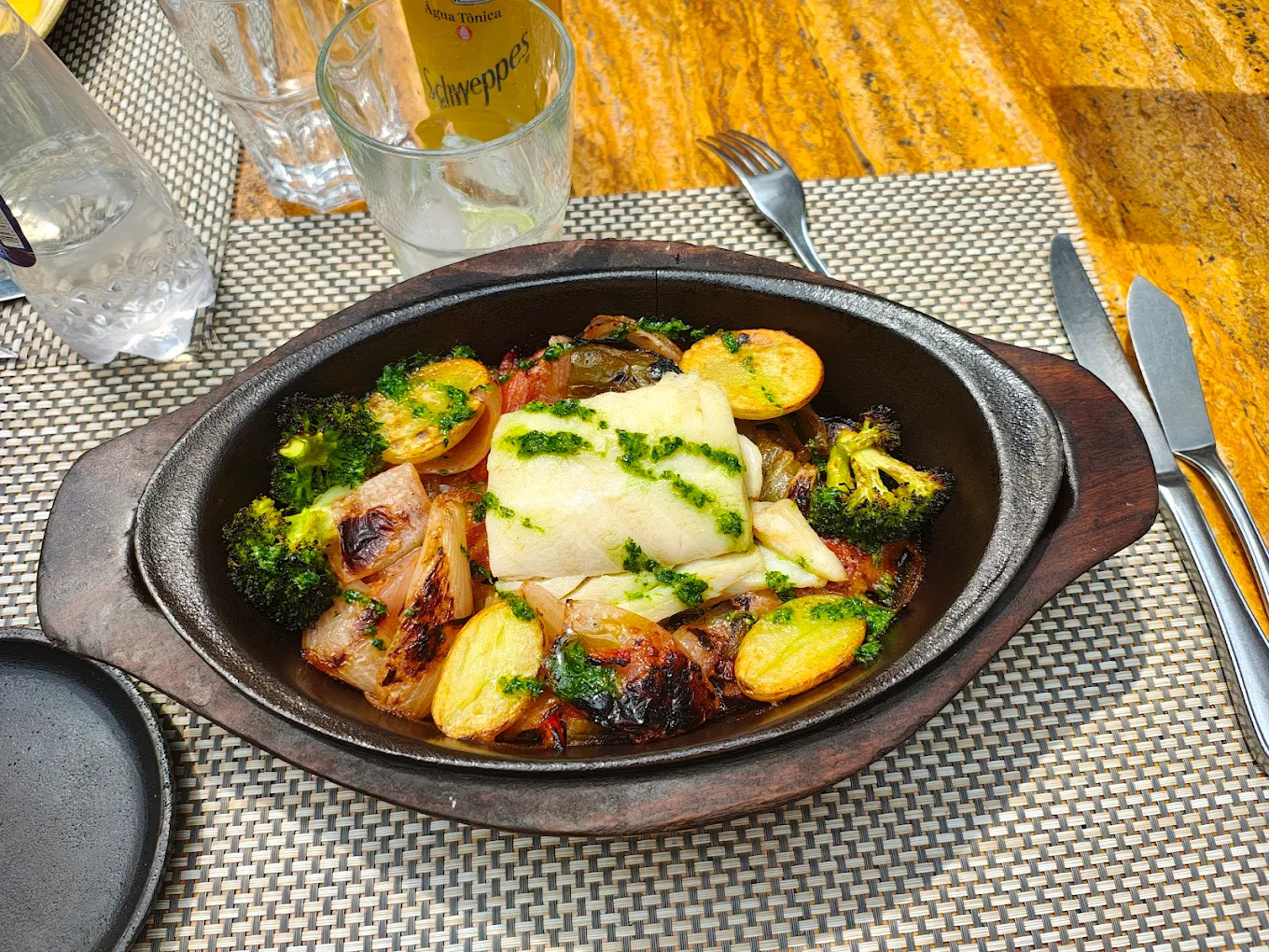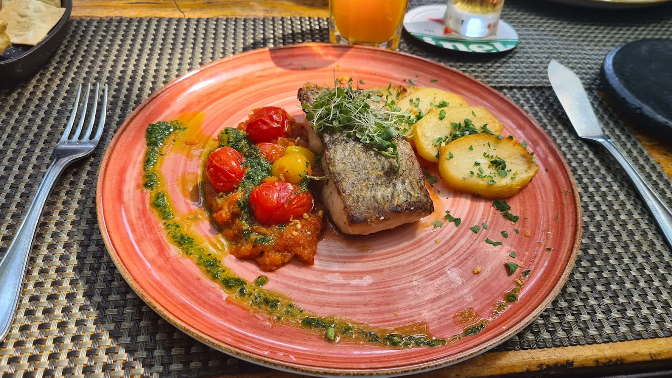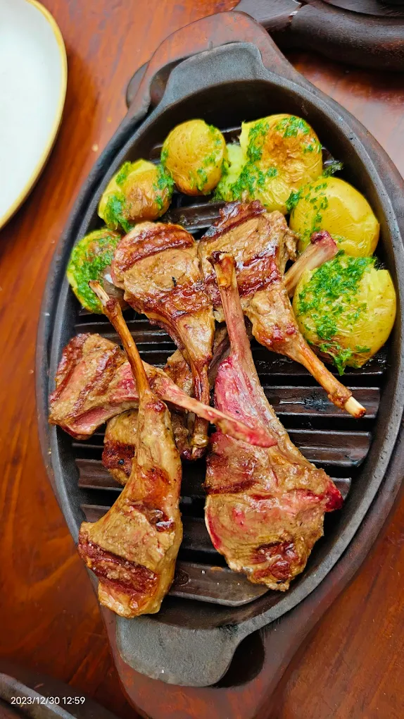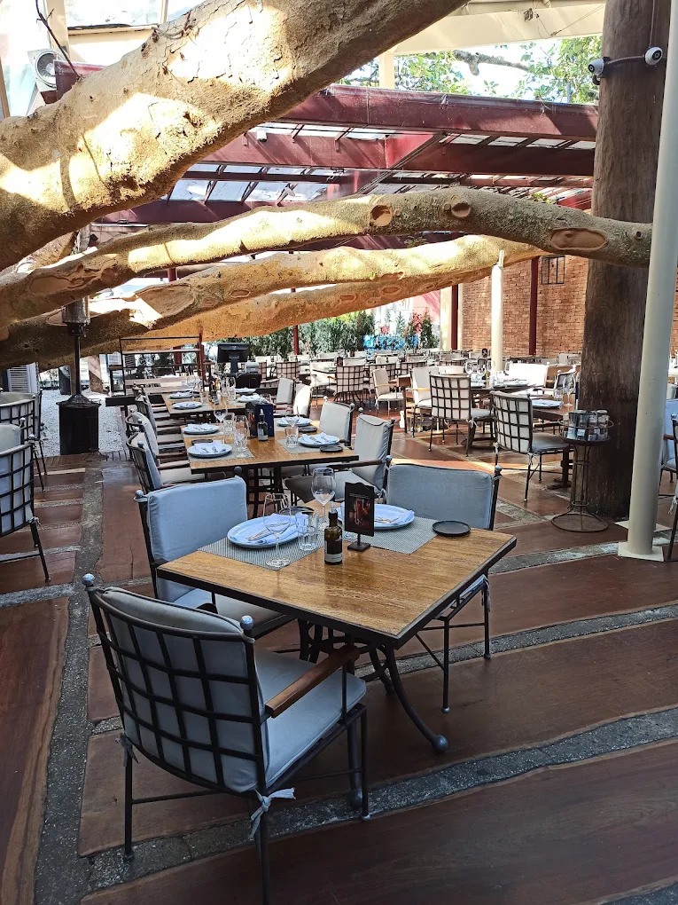 Restaurante elegante com terraço coberto, que serve carnes grelhadas e frutos do mar sob uma árvore gigante.