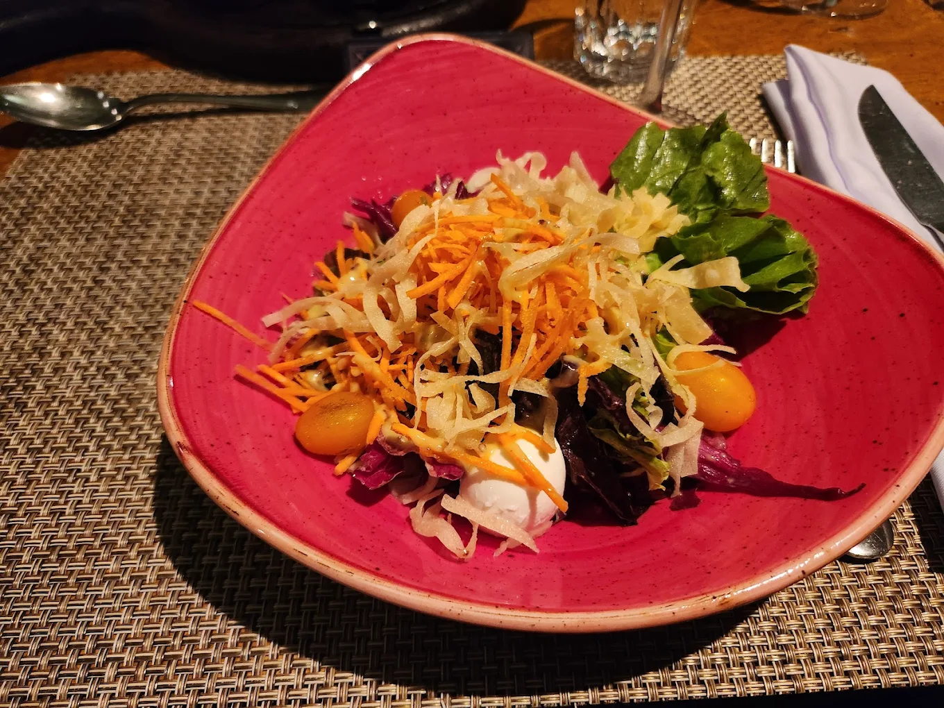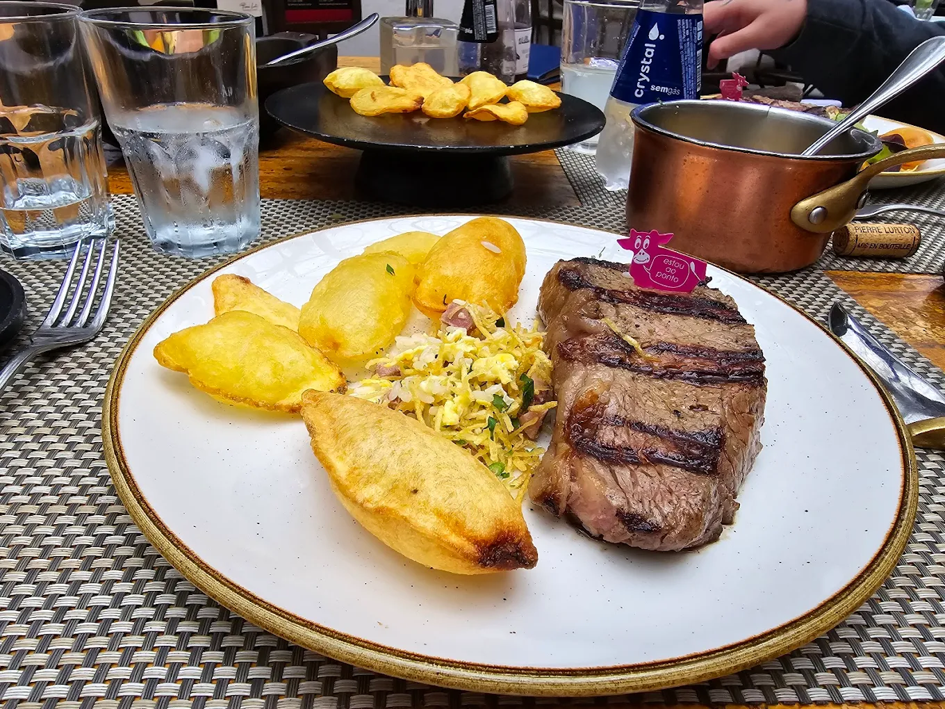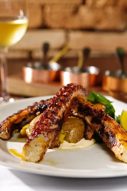 Restaurante elegante com terraço coberto, que serve carnes grelhadas e frutos do mar sob uma árvore gigante.
