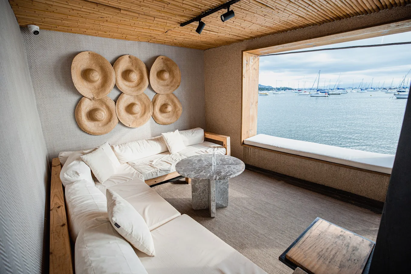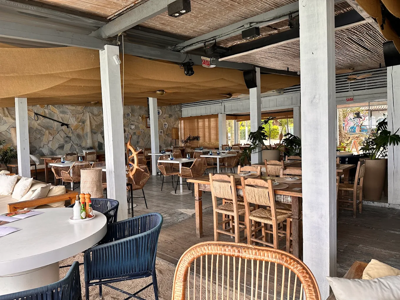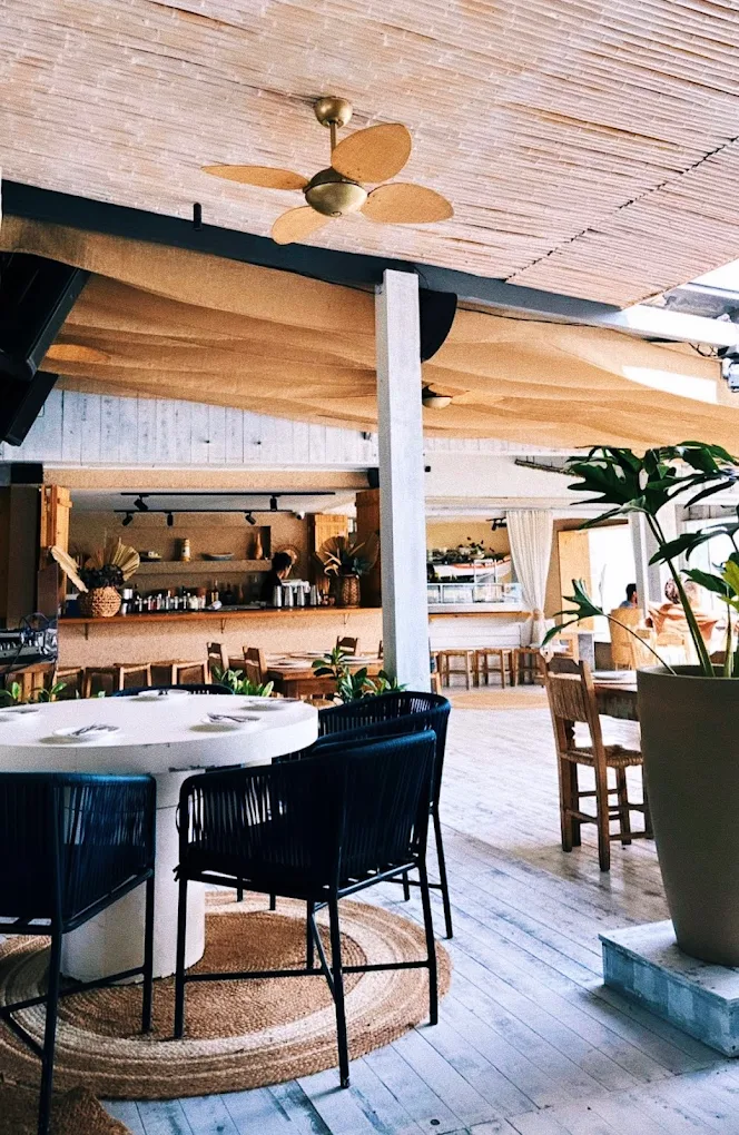 Inspirada na Grécia, a casa oferece drinques e pratos mediterrâneos em espaço descontraído à beira do mar.